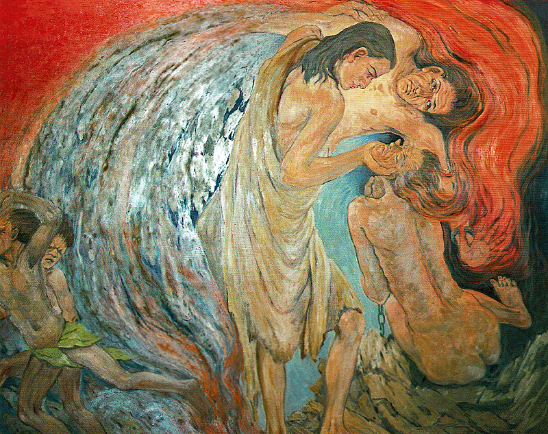 “This is an unusual work for Frank Wesley because of its abstract form combined with detailed, realistic human faces and hands. The impact is of greater momentum than that found in many other of his paintings. The movement of the demons out of the two twisted figures swirls through the canvas in almost full circle, gradually becoming the head of a thousand-headed cobra as it spills down the hillside in the bodies of the pigs. Demonic faces of men and animals are picked out indistinctly in red, blue and grey. All seem to rush with violence and speed to the lower left corner where the wild-eyed swineherds are looking over their shoulders as they race from the frightening event. Jesus is holding the twisting, writhing bodies of the two naked men with gentleness, his head bowed over them in concern and caring. He holds the shoulder of one man from underneath to support him while his other hand is grasping the chin of the frothing naked man who is breaking the chains with which he is bound. Earlier these chains were broken in madness; now their destruction signals a return to sanity.
